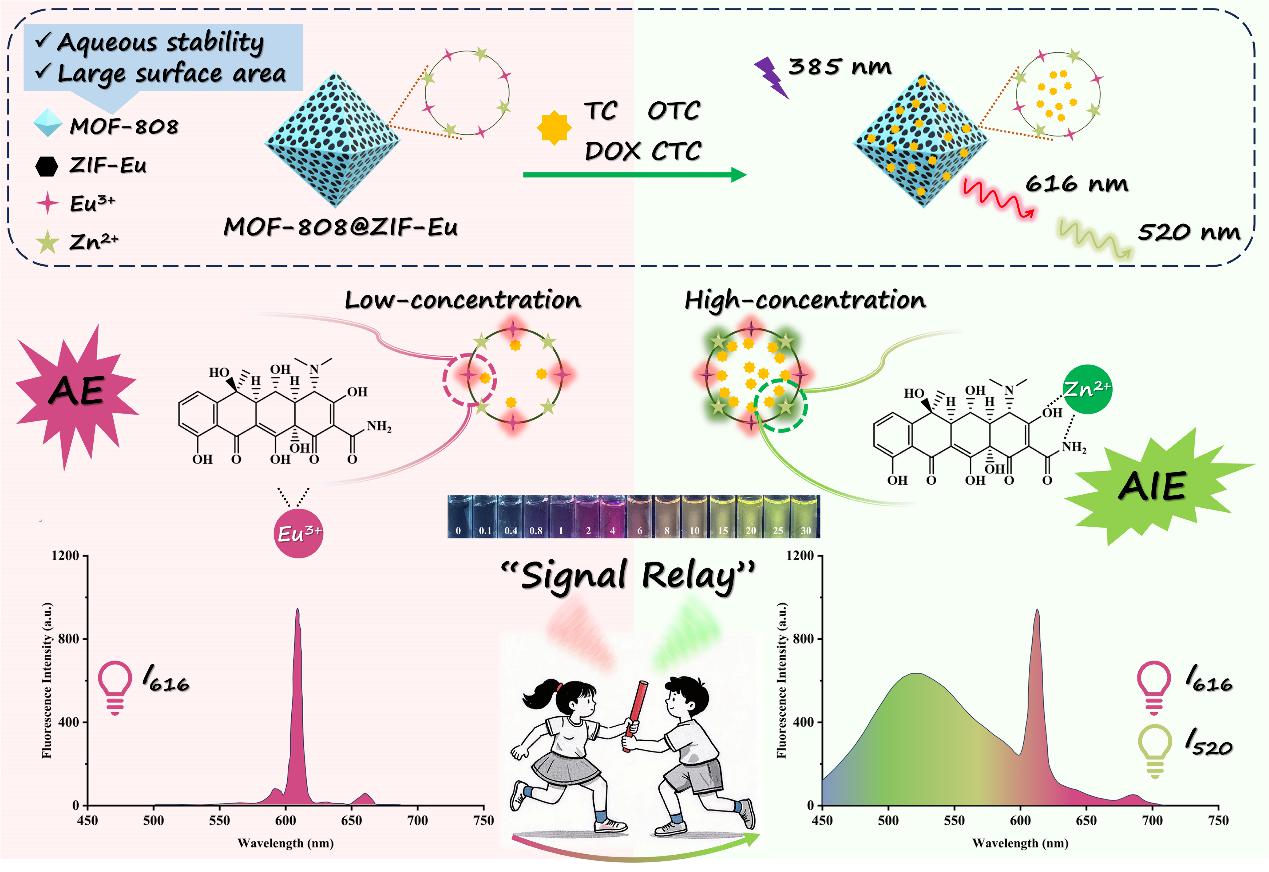 MOF-808@ZIF-Eu检测四环素类抗生素“信号接力”响应模式示意图