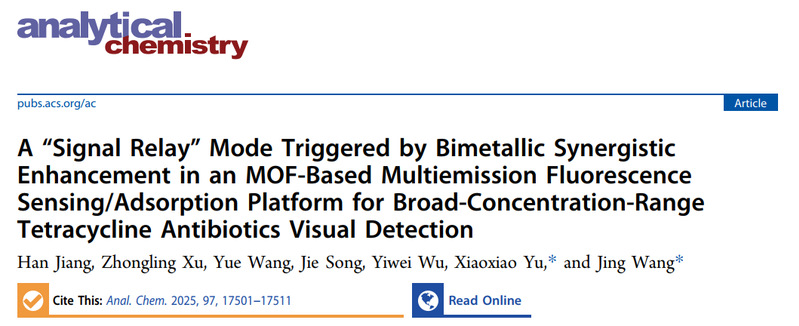 Han Jiang, Zhongling Xu, Yue Wang, Jie Song, Yiwei Wu, Xiaoxiao Yu*, Jing Wang*. A “signal relay” mode triggered by bimetallic synergistic enhancement in an MOF-based multiemission fluorescence sensing/adsorption platform for broad-concentration-range tetracycline antibiotics visual detection.