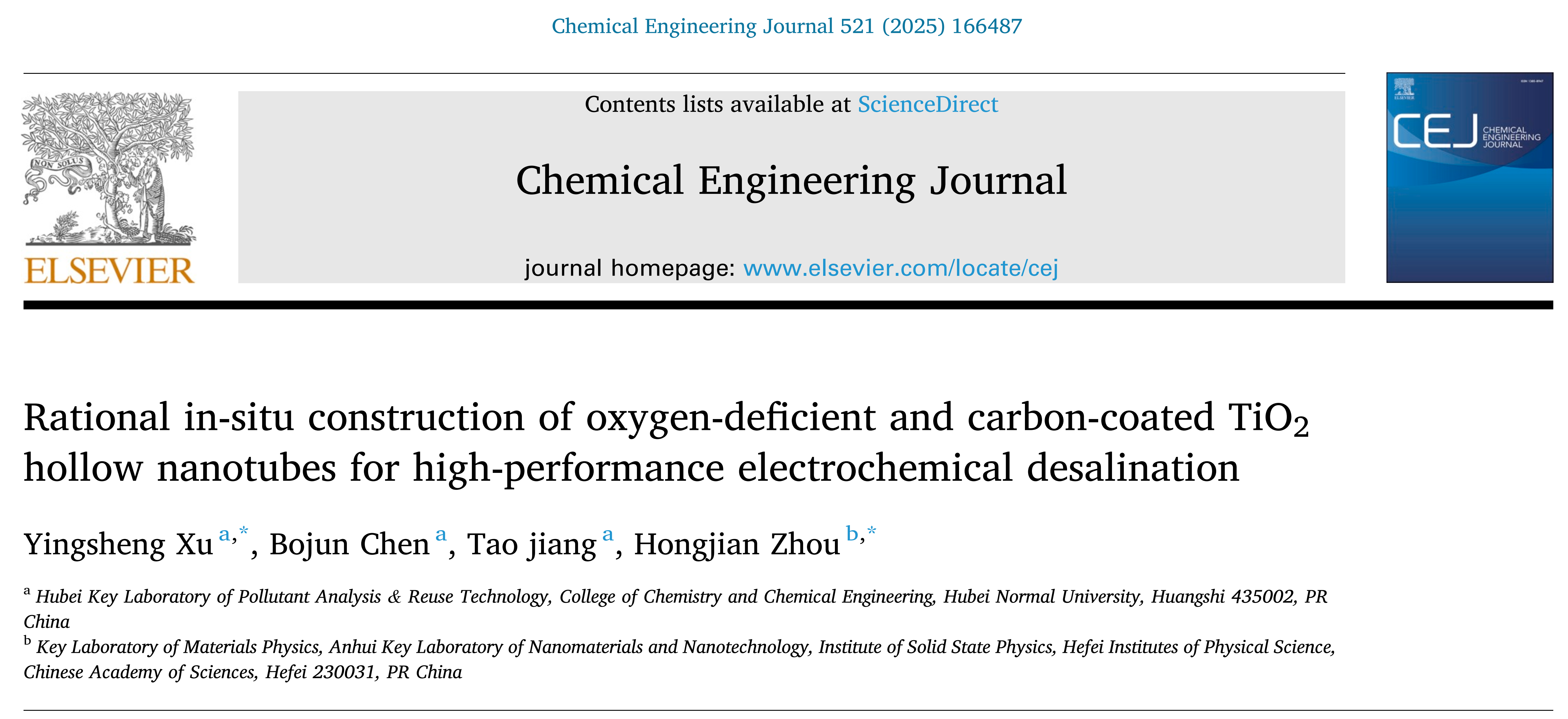 近日,国际知名期刊Chemical Engineering Journal(《化学工程杂志》)在线发表了物理化学教研室徐应生博士团队在电化学脱盐领域的最新研究成果。论文题为“Rational in-situ construction of oxygen-deficient and carbon-coated TiO2 hollow nanotubes for high-performance electrochemical desalination”(《原位构筑高性能碳包覆氧空位TiO2中空纳米管电极用于高效脱盐》)。徐应生博士为论文第一作者兼通讯作者,中科院合肥物质研究院周宏建研究员为论文共同通讯作者,实验与数据处理部分由课题组2022级本科生陈伯骏(论文第二作者)完成,888集团官网为论文第一通讯单位。Chemical Engineering Journal是ELSEVIER(爱思唯尔)出版社旗下材料科学领域TOP期刊、SCI中科院大类一区,最新影响因子为13.2。