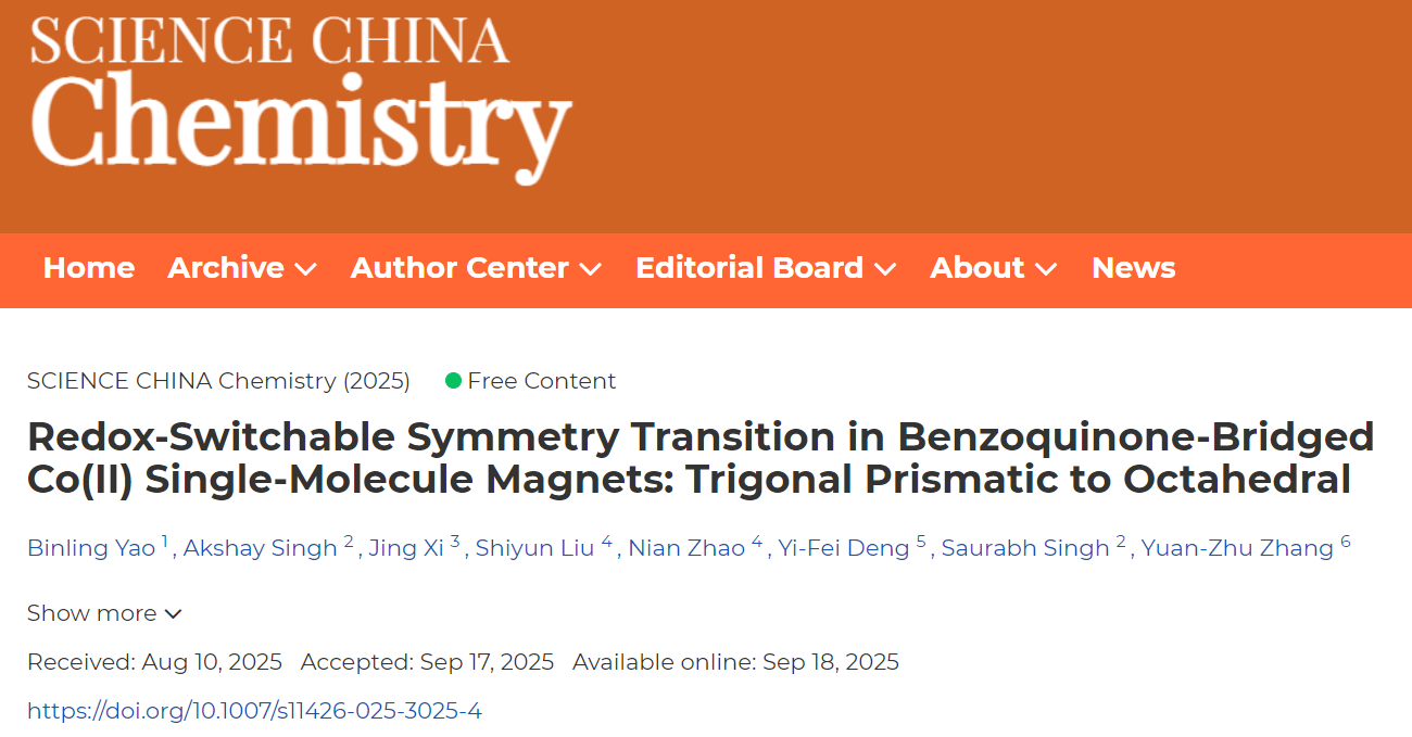 近日,国际知名期刊Science China Chemistry(《科学中国化学》)在线发表了无机化学教研室姚彬玲博士在分子纳米磁体领域的最新研究成果,论文题目为“Redox-Switchable Symmetry Transition in Benzoquinone-Bridged Co(II) Single-Molecule Magnets: Trigonal Prismatic to Octahedral”(《苯醌桥连钴(II)单分子磁体的氧化还原调控对称性转变:三棱柱构型向八面体构型的转换》)。姚彬玲博士为论文第一作者和通讯作者,南方科技大学张元竹教授、印度海得拉巴理工学院Saurabh Singh教授为论文共同通讯作者,888集团官网为论文第一通讯单位,Science China Chemistry是Science Press出版社旗下的化学领域期刊,SCI中科院一区TOP期刊,最新影响因子为9.7。