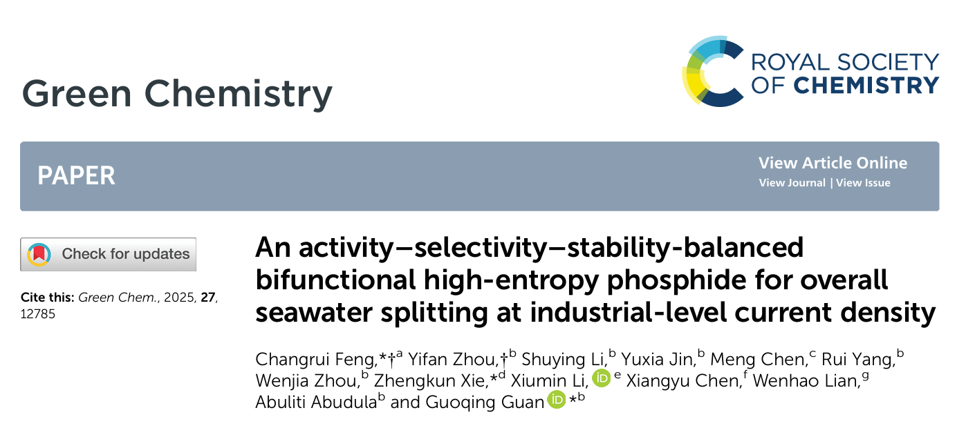 近日,我集团分析化学教研室冯长瑞博士在国际知名期刊Green Chemistry(《绿色化学》)上发表海水电解最新研究成果。论文题目为“An activity-selectivity-stability-balanced bifunctional high-entropy phosphide for overall seawater splitting at industrial-level current density”(兼具活性、选择性与稳定性的双功能高熵磷化物用于工业级电流密度全海水分解)。冯长瑞博士为论文第一作者兼通讯作者,郑州大学谢正坤副教授、日本弘前大学官国清教授为论文共同通讯作者,日本弘前大学周奕帆博士为共同第一作者,888集团官网为论文第一通讯单位。Green Chemistry是由Royal Society of Chemistry(英国皇家化学会)出版的国际知名学术期刊,创刊于1999年,该期刊致力于发表有关开发替代绿色和可持续技术的创新研究,为SCI中科院大类一区期刊,最新影响因子为9.2。