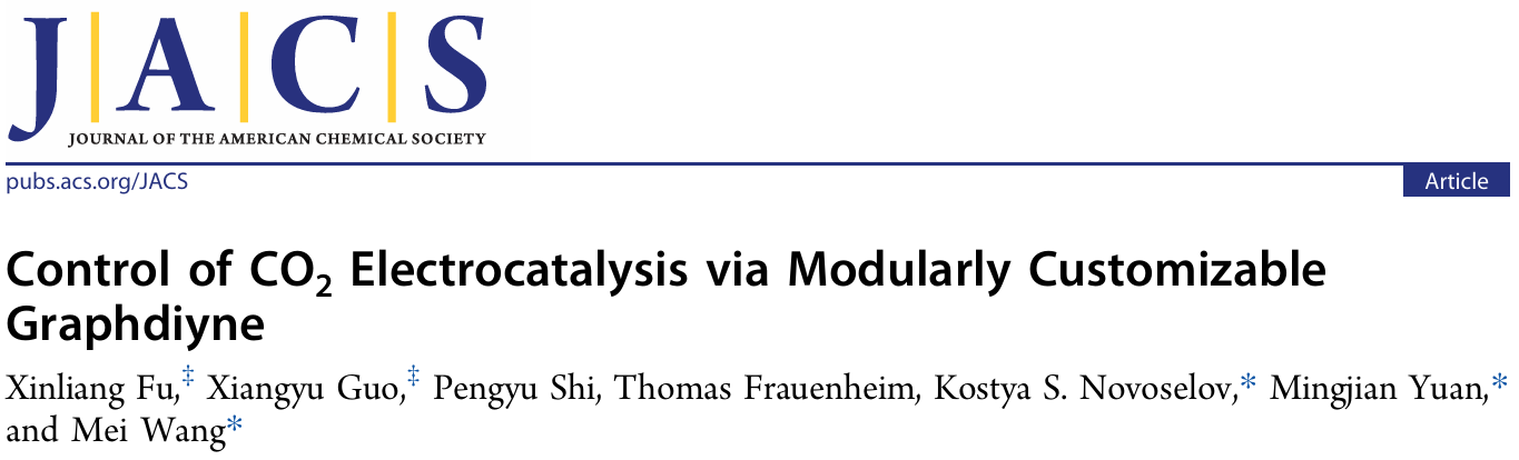 近日,国际权威期刊Journal of the American Chemical Society(《美国化学会志》)在线发表了物理化学教研室付信亮博士最新研究成果。论文题为“Control of CO2 Electrocatalysis via Modularly Customizable Graphdiyne”(通过模块化可定制石墨炔实现CO2电催化调控)。付信亮博士和德国不来梅大学郭翔宇博士为该论文共同第一作者,新加坡国立大学Kostya S. Novoselov教授、南开大学袁明鉴教授、天津理工大学王梅教授为共同通讯作者,888集团官网为论文第二单位。Journal of the American Chemical Society创刊于1879年,是美国化学会的旗舰期刊、中科院一区top期刊及自然指数(Nature Index)收录期刊,致力于发表化学学科领域的原创性突破性研究成果,最新影响因子为15.6。